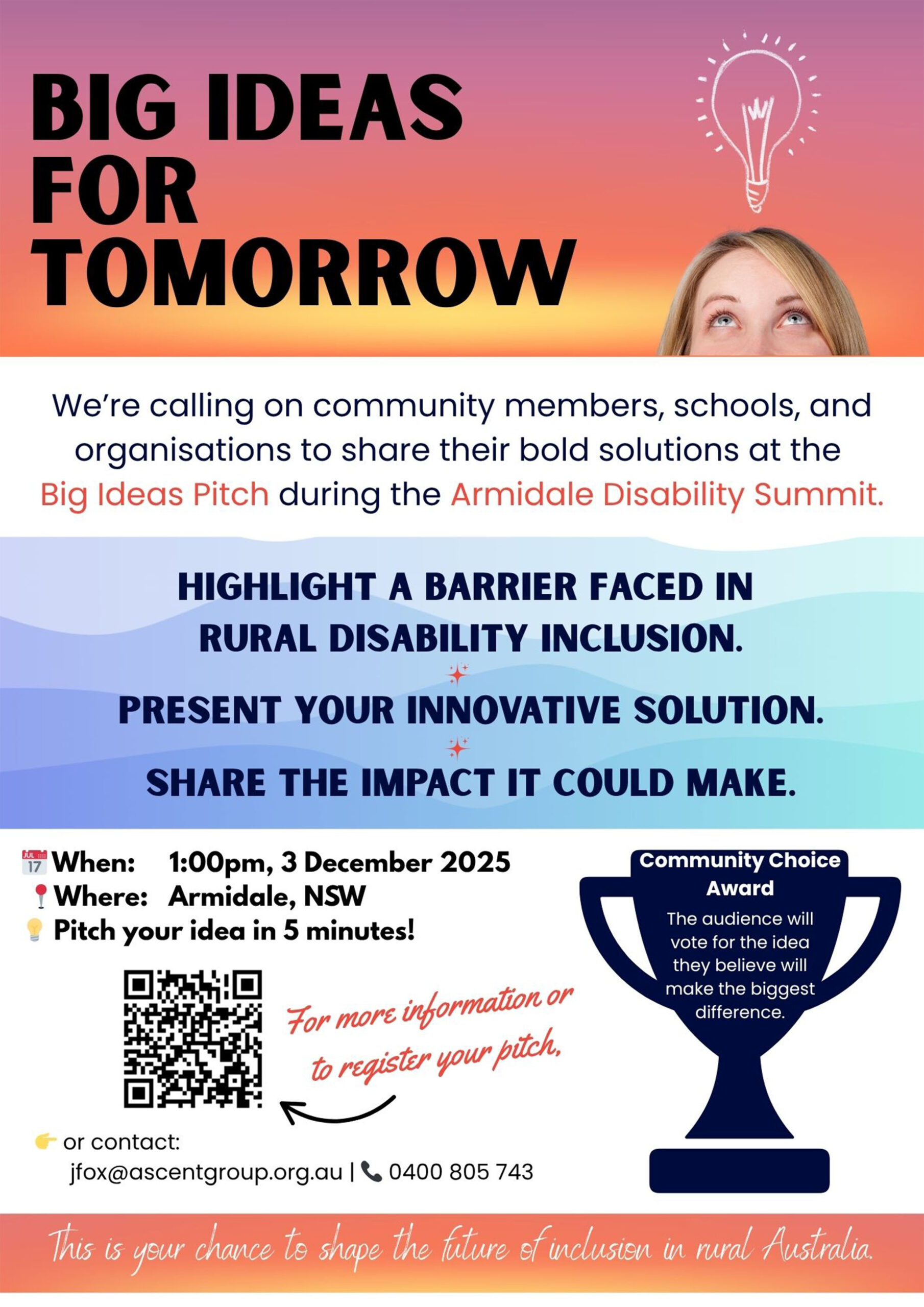We’re calling on community members, schools and organisations to share their bold solutions an the Big Ideas Pitch during the Armidale Disability Summit.